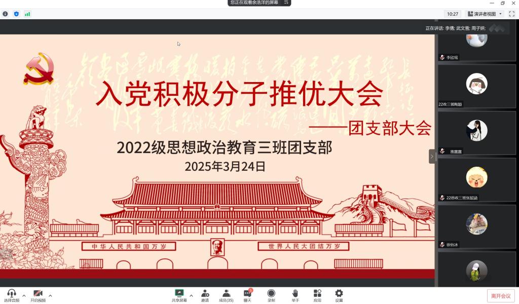 2月24日下午,2026年世界杯官网2022级思想政治教育三班利用腾讯会议在线上召开入党积极分子推优大会。公司2022级思想政治教育三班班主任任婷与班级全体团员共同参加此次大会。大会由团支书余浩洋主持。