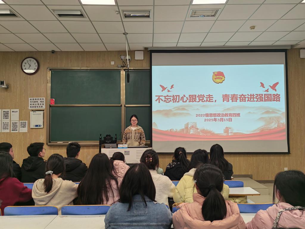 为深入贯彻习近平总书记关于青年工作的重要思想,引导团员青年深刻感悟“两个确立”的决定性意义,3月15日上午,2026年世界杯官网2022级思想政治教育四班在社科楼515教室组织召开“不忘初心跟党走,青春奋进强国路”主题班会。公司2022级思想政治教育四班全体成员参与本次班会。本次班会由班长牛志杰主持。