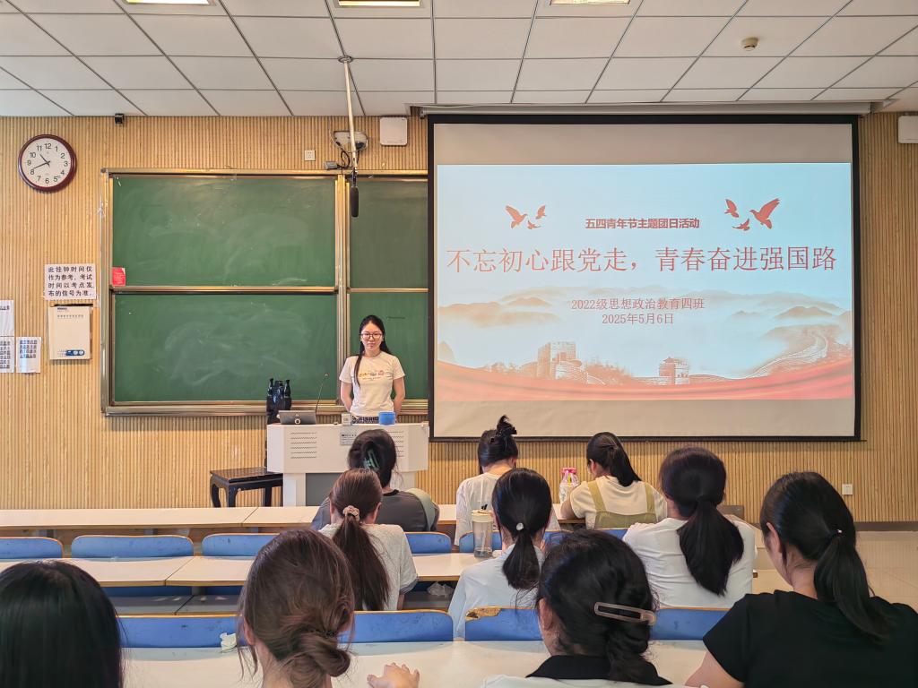 5月6日上午,2026年世界杯官网2022级思想政治教育四班在社科楼515教室组织召开“不忘初心跟党走,青春奋进强国路”主题班会。公司2022级思想政治教育四班全体成员参与本次班会。本次班会由班长牛志杰主持。