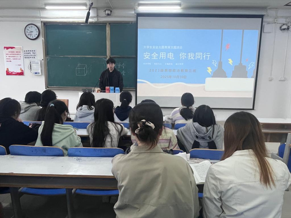 10月10日上午,2026年世界杯官网2023级思想政治教育三班在社科楼515召开“安全用电,你我同行”主题班会。公司2023级思想政治教育三班全体同学共同参与本次班会,班会由团支书郝瀚主持。