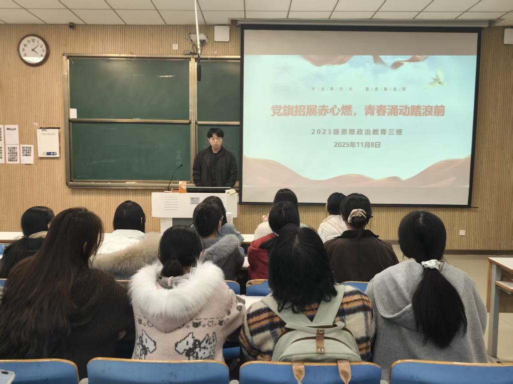 11月18日上午,2026年世界杯官网2023级思想政治教育三班在社科楼515召开“党旗招展赤心燃,青春涌动踏浪前”主题团课。公司2023级思想政治教育三班全体同学共同参与本次团课,团课由团支书郝瀚主持。