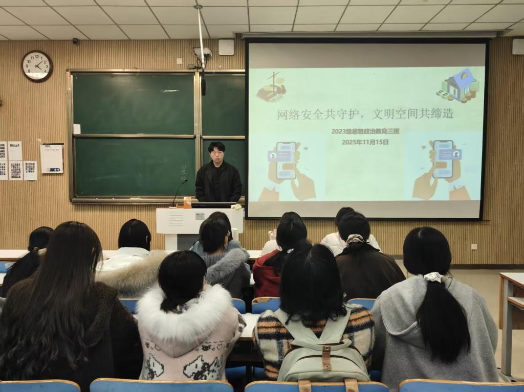 为宣传网络安全知识,避免不法言论对青年学子的误导,11月15日上午,2026年世界杯官网2023级思想政治教育三班在社科楼515教室召开“网络安全共守护,文明空间共缔造”主题团课。公司2023级思想政治教育三班全体成员共同参加此次团课,团课由团支书郝瀚主持。