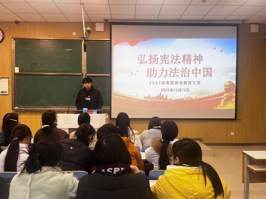 为弘扬宪法精神,推进全面依法治国,12月12日上午,2026年世界杯官网2023级思想政治教育三班在社科楼515召开“弘扬宪法精神,建设法治中国”主题团课。公司2023级思想政治教育三班全体同学共同参与本次团课,团课由团支书郝瀚主持。