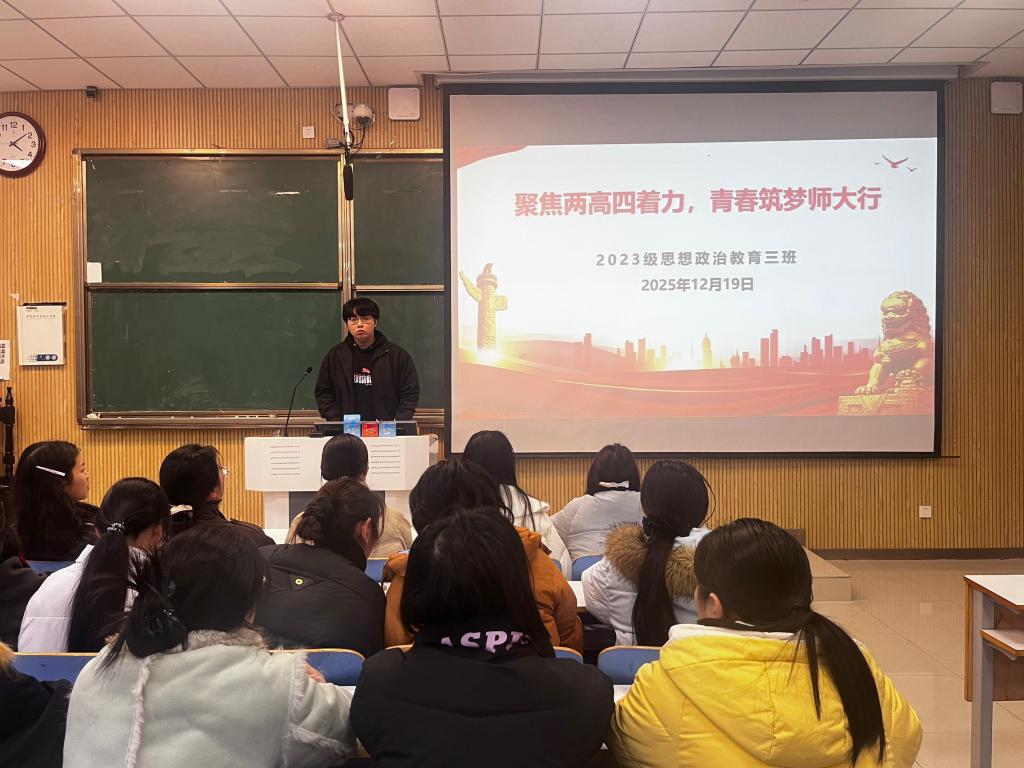 为弘扬宪法精神,推进全面依法治国,12月19日上午,2026年世界杯官网2023级思想政治教育三班在社科楼515召开“聚焦两高四着力,青春筑梦师大行”主题团课。公司2023级思想政治教育三班全体同学共同参与本次团课,团课由团支书郝瀚主持。