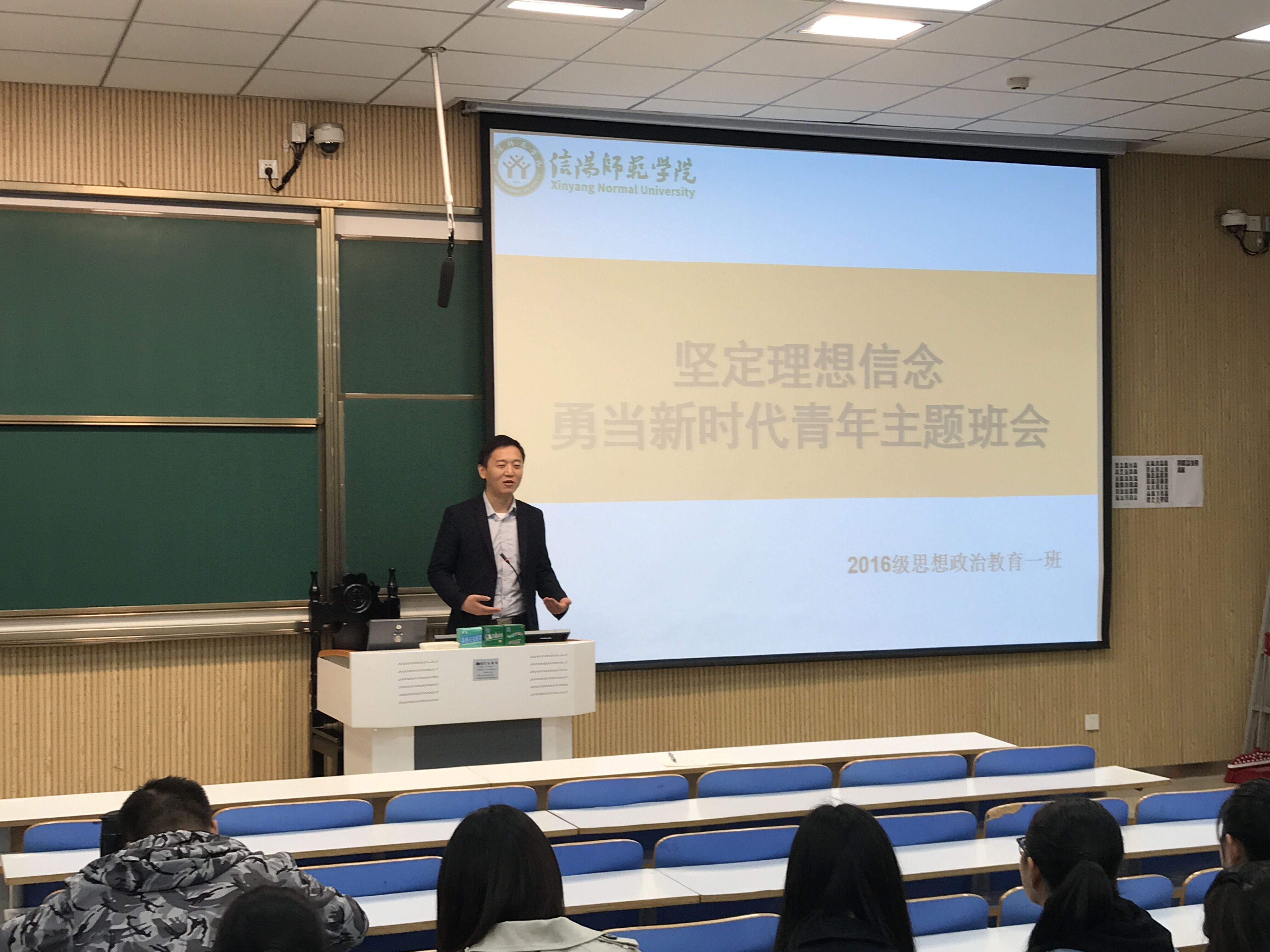 10月25日下午,2016级思想政治教育一班坚定理想信念,勇当新时代青年主题班会在社科楼515教室顺利召开,2016级思想政治教育一班全体成员共同参加,班级专职辅导员曹栋出席并发表讲话。班会由班长李晨豪主持。