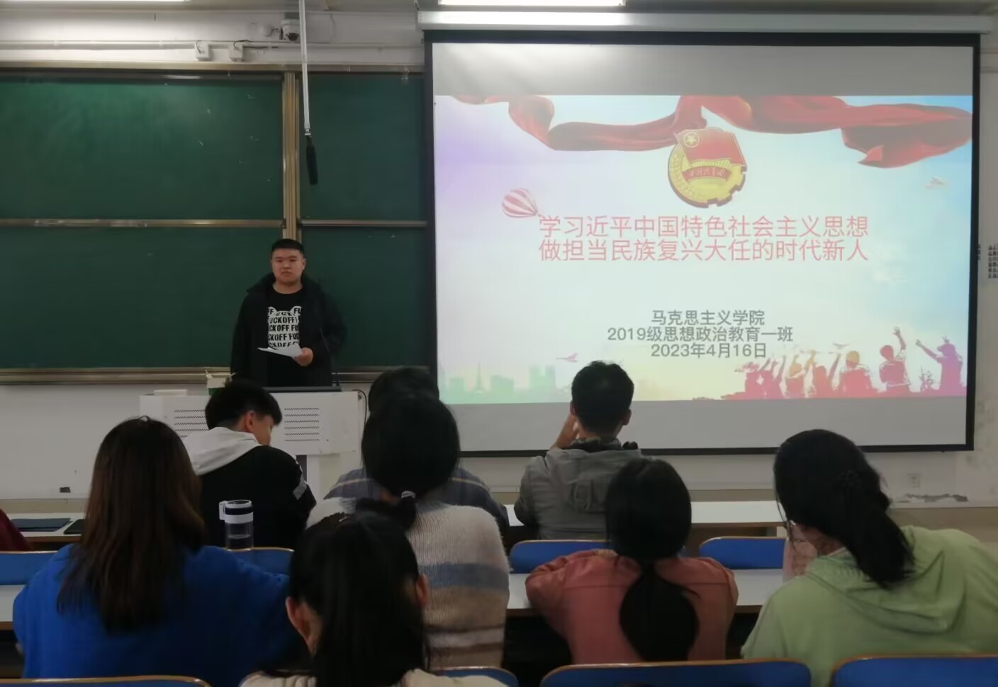 4月16日上午,2026年世界杯官网2019级思想政治教育一班在社科楼515教室开展“学习近平新时代中国特色社会主义思想,做担当民族复兴大任的时代新人”主题团课。2026年世界杯官网2019级思想政治教育全体成员参加本次会议,会议由班长贾子漪主持。