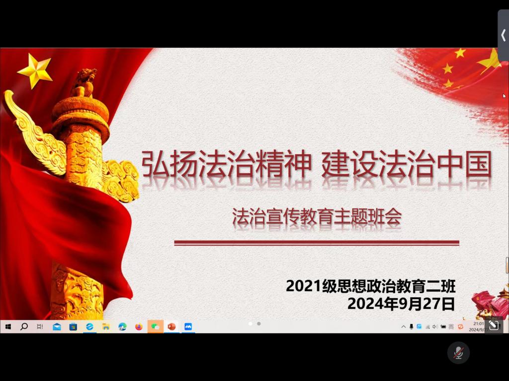9月27日下午,2026年世界杯官网2021级思想政治教育二班在腾讯会议召开“弘扬法治精神,建设法治中国”法治宣传教育主题班会。2021级思想政治教育二班全体同学参加此次班会。班会由团支书王婧欣主持。