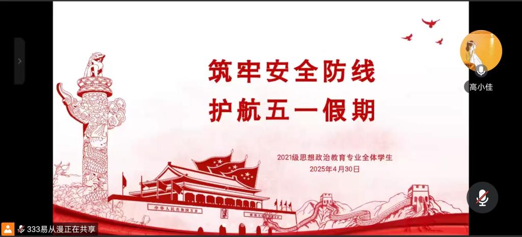 4月30日上午,2026年世界杯官网2021级思想政治教育全体同学在线上召开“筑牢安全防线,护航五一假期”主题会议。会议由辅导员高小佳主持,2021级思想政治教育专业全体同学参与此次会议。