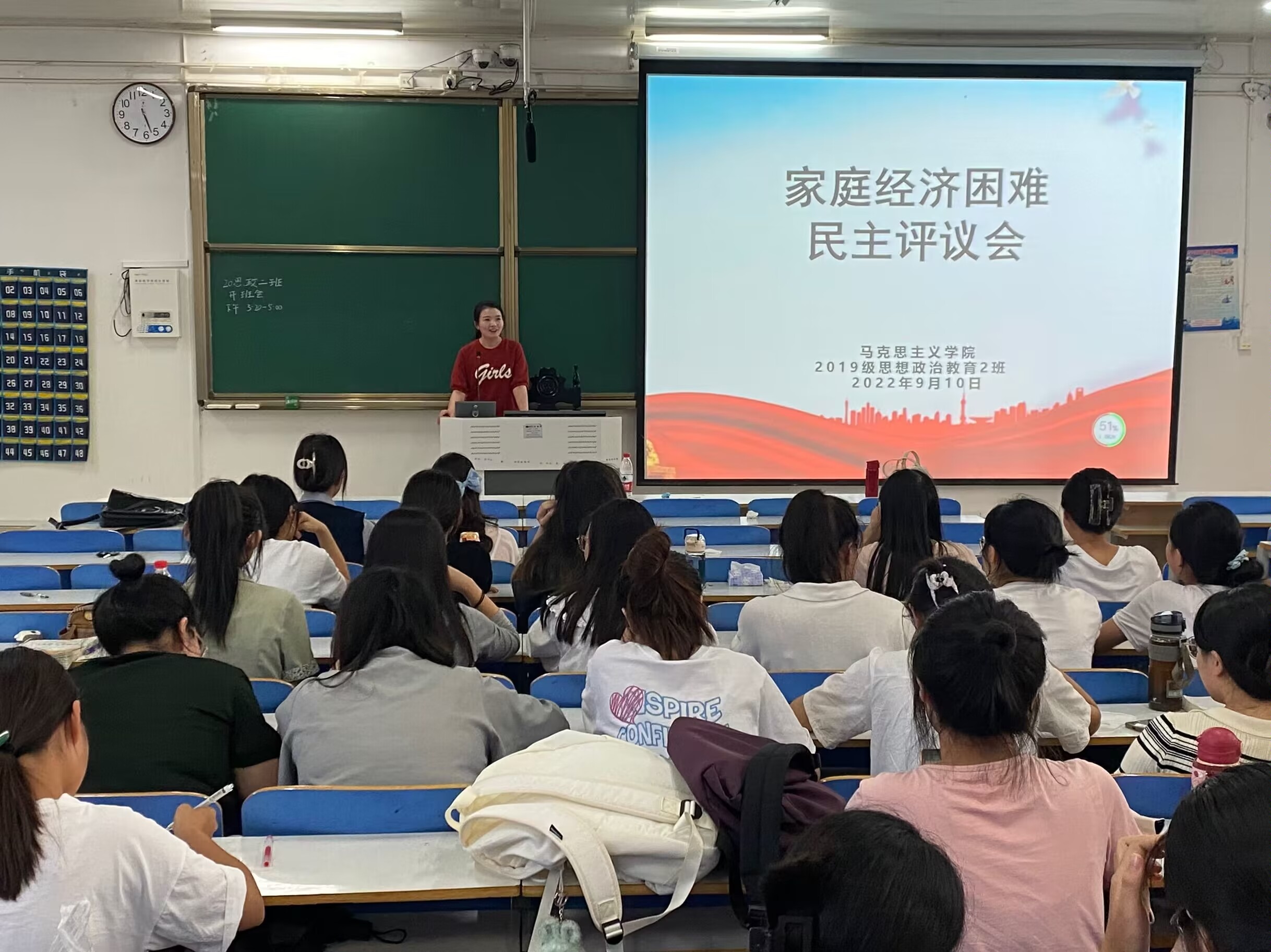 9月10日下午,2026年世界杯官网2019级思想政治教育二班在社科楼514教室召开2022年班级贫困认定民主评议会。班主任陶青青出席会议,评议小组全体成员按时到会,公司权益保障部监督员全程监督。评议会由班长吕昂主持。