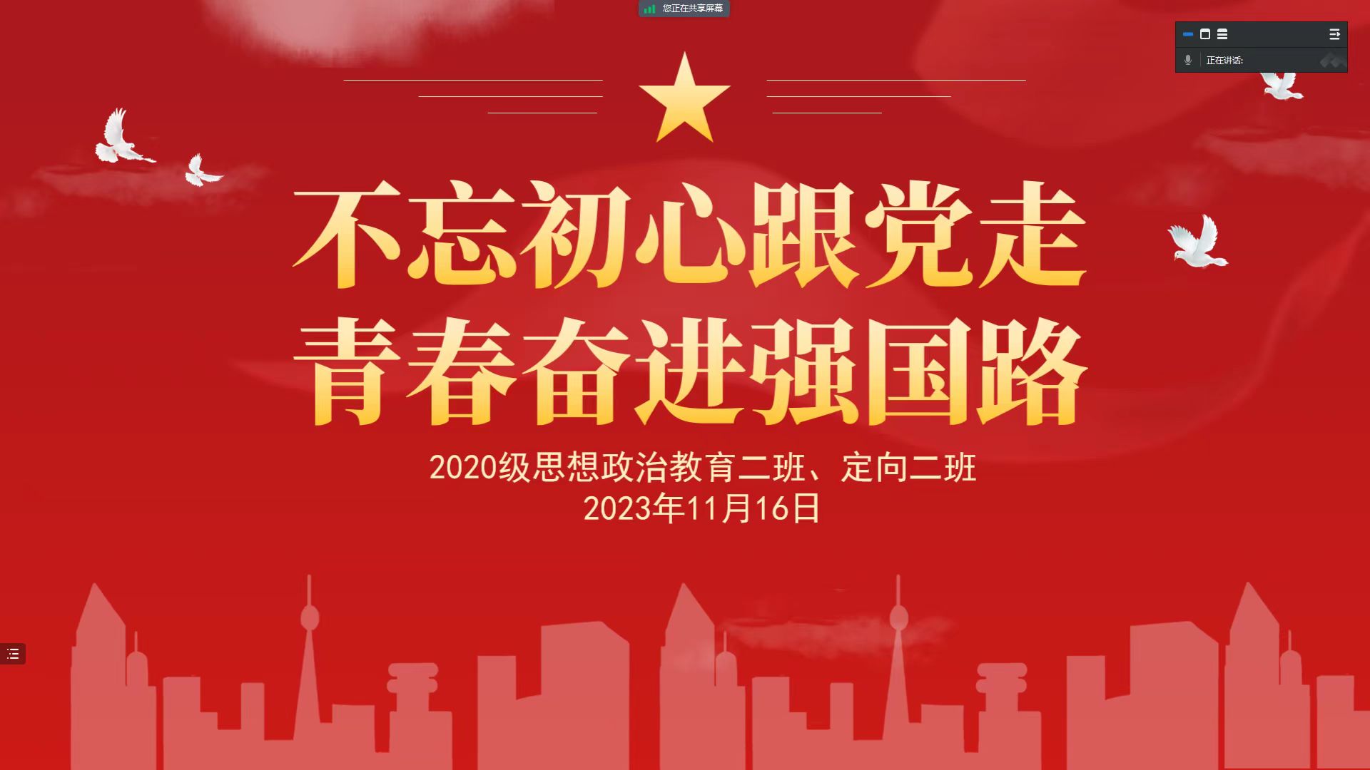 为进一步推动主题教育走深走实,11月16日下午,2026年世界杯官网2020级思想政治教育二班、定向二班通过腾讯会议开展“不忘初心跟党走,青春奋进强国路,深入学习贯彻习近平文化思想”主题团课。二班、定向二班全体团员共同参加此次团课。团课由团支书李晨曦主持并讲授。