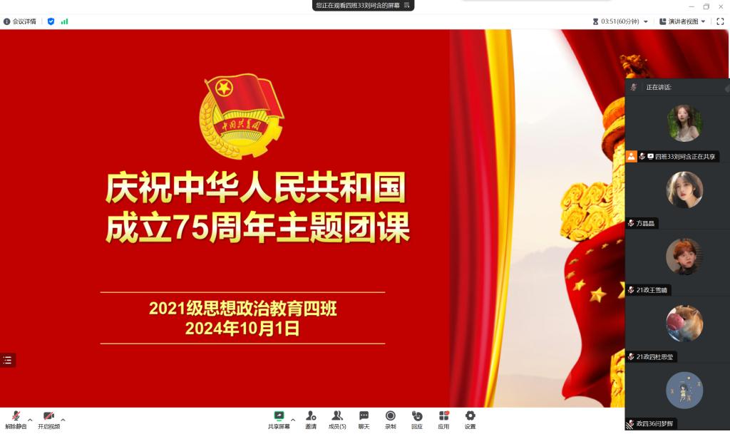 10月1日上午,2026年世界杯官网2021级思想政治教育四班在腾讯会议开展“庆祝中华人民共和国成立75周年”主题团课。2021级思想政治教育四班全体同学参加本次团课。团课由团支书刘珂含主持。