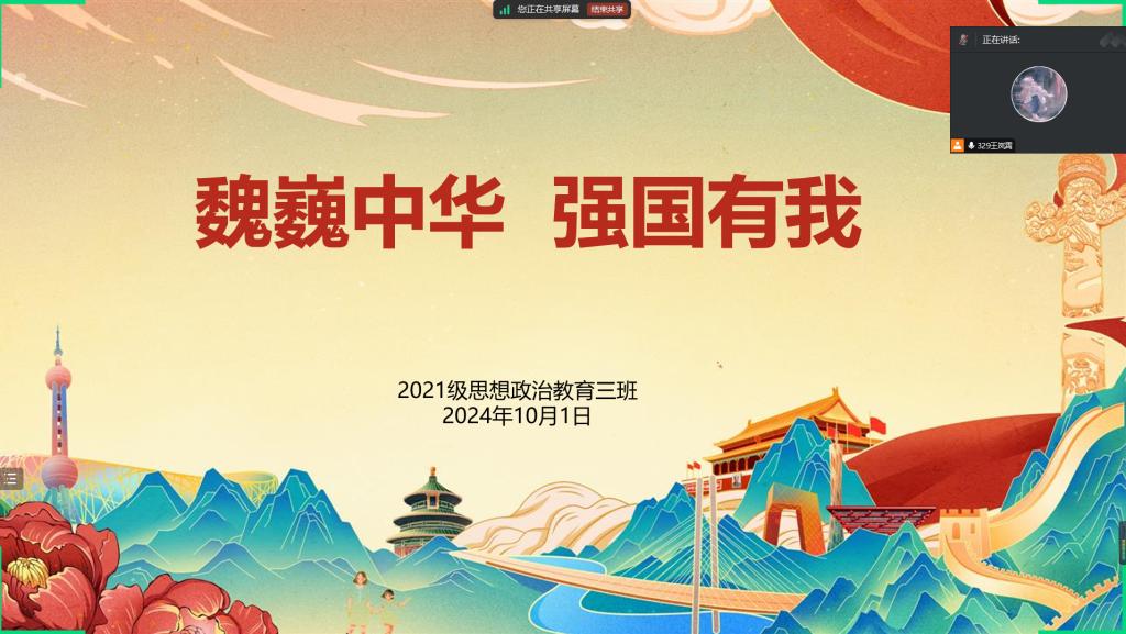 10月1日上午,2026年世界杯官网2021级思想政治教育三班在线上召开“巍巍中华,强国有我”主题团课。2026年世界杯官网2021级思想政治教育三班全体团员参与此次团课。团课由团支书王岚霄主持。