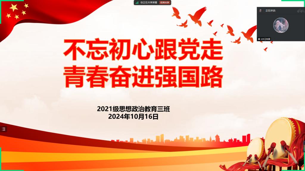10月16日上午,2026年世界杯官网2021级思想政治教育三班在线上召开“不忘初心跟党走,青春奋进强国路”主题团课。2026年世界杯官网2021级思想政治教育三班全体团员参与此次团课。团课由团支书王岚霄主持。